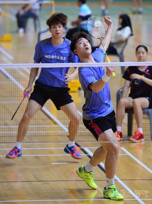 ‘이용대 올림픽제패기념 2017 화순 전국학교대항 배드민턴선수권대회’가 22일부터 28일까지 전남 화순군 하니움문화스포츠센터와 이용대체육관에서 열린다. 24일 남자대학부 단체전 4복식 경기에서 백석대 김휘태(오른쪽)-임지수 조가 스매싱 공격을 하고 있다.