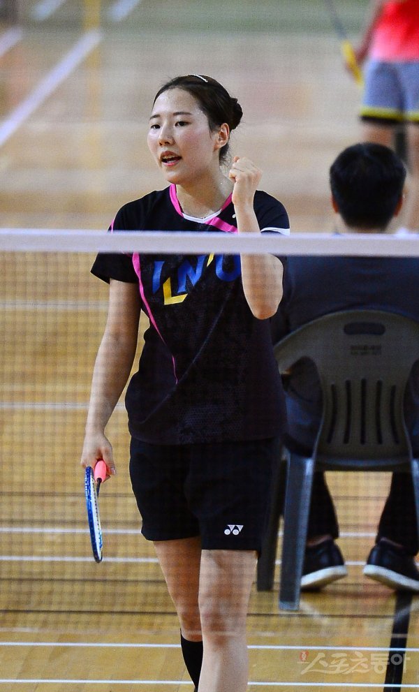 ‘이용대 올림픽제패기념 2017 화순 전국학교대항 배드민턴선수권대회’가 22일부터 28일까지 전남 화순군 하니움문화스포츠센터와 이용대체육관에서 열린다. 24일 여자대학부 단체전 2단식 경기에서 인천대 이승희가 공격 성공 후 기뻐하고 있다.