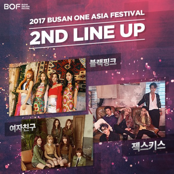 젝스키스, 블랙핑크, 여자친구, 에일리 등이 오는 10월, 부산을 방문해 한류 팬들과 만난다. 부산광역시가 주최하고 부산관광공사가 주관하는 아시아 No.1 한류페스티벌 ‘2017 부산원아시아페스티벌'(Busan One Asia Festival 2017, 이하 BOF)의 2차 라인업이 공개되며 뜨거운 무대를 예고하고 있다.