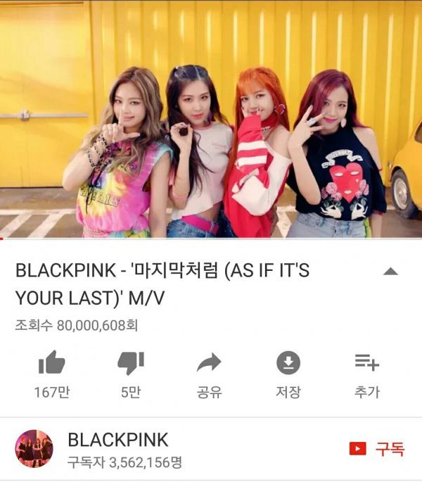 블랙핑크의 ‘마지막처럼’ 뮤직비디오는 오늘(24일) 오후 7시 50분 기준 유튜브 조회수 8천만뷰를 넘어섰다. 공개 32일 1시간(769시간) 만에 세운 기록이다. 7천만뷰를 돌파한지 일주일이 채 되지 않아 이룬 성과이자 최단 기간 기록을 또 다시 경신했다.