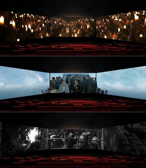 ‘군함도’ 스크린X 버전은 1945년 실제 군함도 모습의 2/3를 그대로 재현한 세트장을 쓰리캠(Three Cam)으로 촬영해 현장감을 극대화했다. 270도 3면에 펼쳐지는 탄광 속 모습은 고립감과 압박감을 더욱 강렬하게 느끼게 한다.