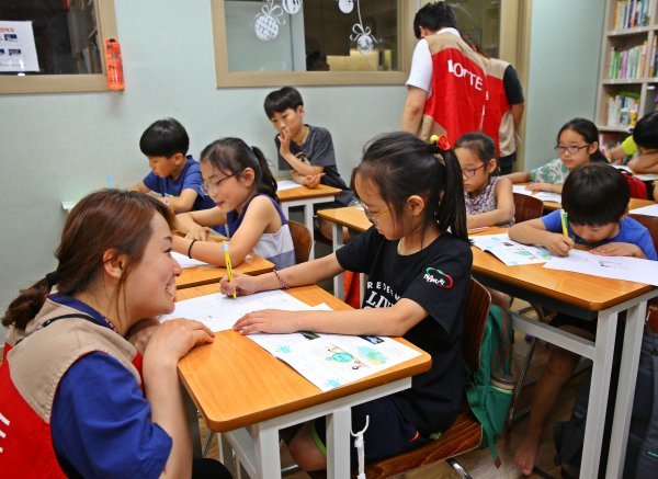 롯데마트 청량리점 샤롯데 봉사단이 진행한 ‘꿈나무, 물 소중함 교육’ 캠페인 모습. 사진제공 l 롯데마트