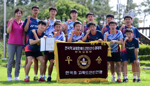 ‘이용대 올림픽제패기념 2017 화순 전국학교대항 배드민턴선수권대회’가 22일부터 28일까지 전남 화순군 하니움문화스포츠센터와 이용대체육관에서 열린다. 25일 남자고등부 단체 결승전에서 우승을 차지한 전주생명과학고 김선미 감독과 선수들이 기념촬영을 하고 있다.