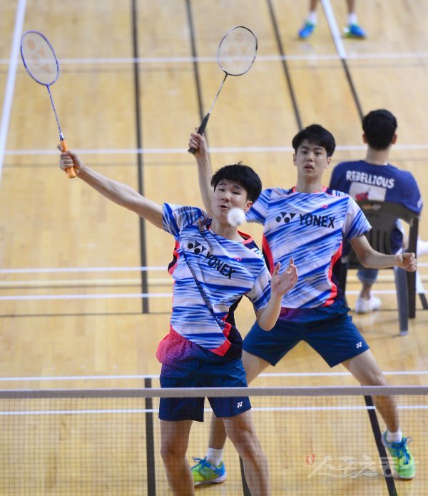 ‘이용대 올림픽제패기념 2017 화순 전국학교대항 배드민턴선수권대회’가 22일부터 28일까지 전남 화순군 하니움문화스포츠센터와 이용대체육관에서 열린다. 25일 남자고등부 단체 결승전 3복식 경기에서 전주생명과학고 박설현(왼쪽)-방윤담 조가 스매싱 공격을 하고 있다.