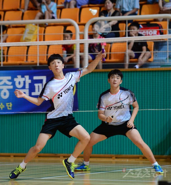 ‘이용대 올림픽제패기념 2017 화순 전국학교대항 배드민턴선수권대회’가 22일부터 28일까지 전남 화순군 하니움문화스포츠센터와 이용대체육관에서 열린다. 25일 남자중학부 단체 결승전 3복식 경기에서 당진중 진용(왼쪽)-이병진 조가 리턴을 하고 있다.