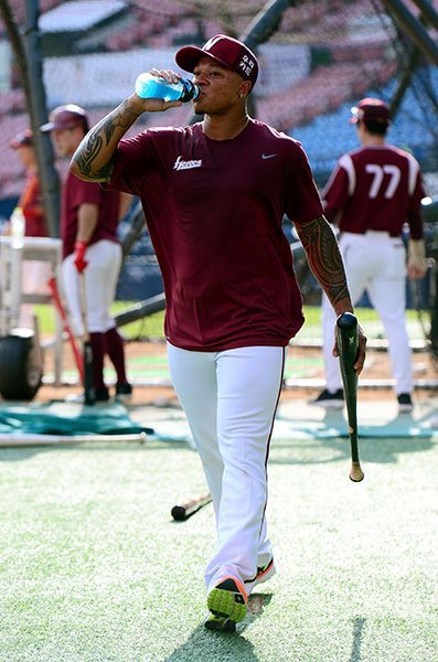 25일 서울 잠실야구장에서 ‘2017 타이어뱅크 KBO리그‘ LG 트윈스와 넥센 히어로즈의 경기가 열린다. 경기전 넥센 새 외국인 선수 초이스가 훈련을 마친 뒤 음료를 마시고 있다. 잠실 | 김민성 기자 marineboy@donga.com