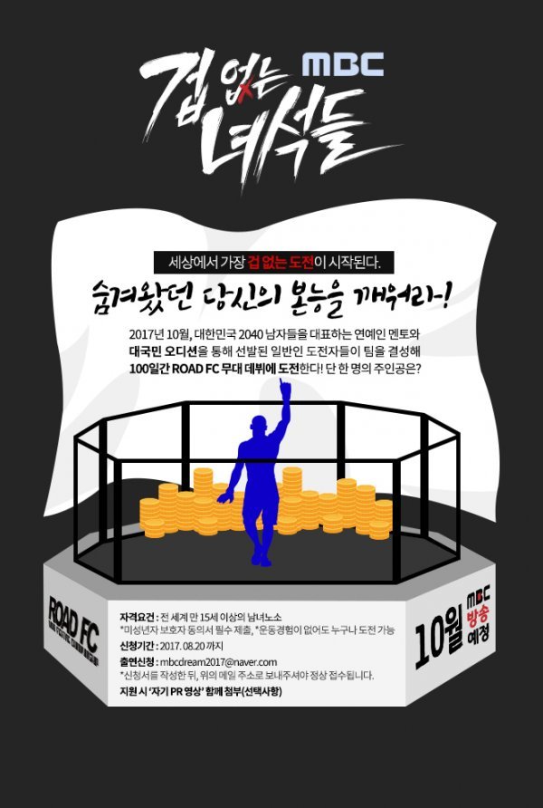 ‘겁 없는 녀석들’은 오는 10월 방송예정이며, 다음 달 20일까지 참가 신청을 받는다. 참가 지원서는 MBC 홈페이지와 로드FC 홈페이지에서 다운 받을 수 있으며 이메일로 지원하면 된다.