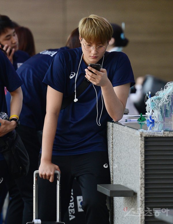 26일 홍성진 감독이 이끄는 여자배구대표팀이 2017년 국제배구연맹(FIVB)월드그랑프리 세계여자배구대회 결선라운드 출전을 위해 인천국제공항을 통해 체코 오스트라바 출국을 했다. 김희진이 스마트폰을 만지고 있다.