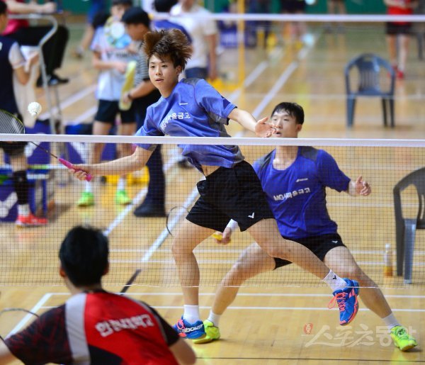 ‘이용대 올림픽제패기념 2017 화순 전국학교대항 배드민턴선수권대회’가 22일부터 28일까지 전남 화순군 하니움문화스포츠센터와 이용대체육관에서 열린다. 26일 남자대학부 복식 준결승에서 백석대 임지수(왼쪽)-김휘태 조가 스매싱 공격을 하고 있다.