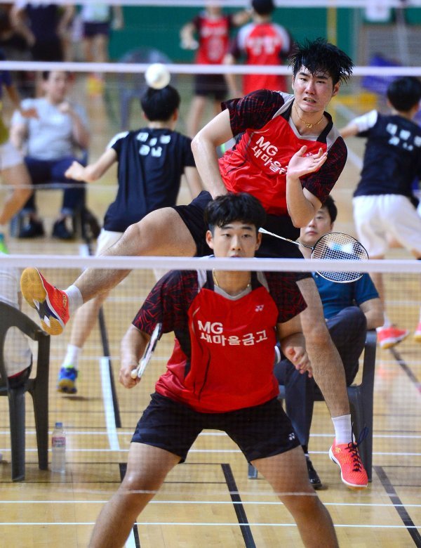 ‘이용대 올림픽제패기념 2017 화순 전국학교대항 배드민턴선수권대회’가 22일부터 28일까지 전남 화순군 하니움문화스포츠센터와 이용대체육관에서 열린다. 26일 남자대학부 복식 준결승에서 한림대 전호진(위)-윤대일조가 스매싱 공격을 하고 있다.