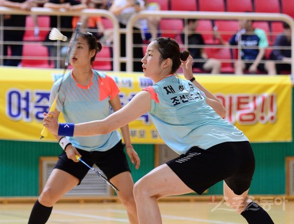 ‘이용대 올림픽제패기념 2017 화순 전국학교대항 배드민턴선수권대회’가 22일부터 28일까지 전남 화순군 하니움문화스포츠센터와 이용대체육관에서 열린다. 26일 여자대학부 복식 준결승에서 조선대 채희수(오른쪽)-김예솔 조가 리턴을 하고 있다.