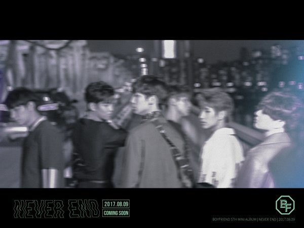 소속사 스타쉽엔터테인먼트측은 26일 공식 SNS를 통해 \'2017.08.09 PM 6:00 BOYFRIEND –NEVER END! COMEBACK COMING SOON!\' 이라는 글과 함께 커밍순 이미지를 게재했다. 사진에는 보이프렌드가 대교위를 거닐고 있는 모습이 담겨져 있다. 아련한 흑백감성이 시선을 사로잡는다.