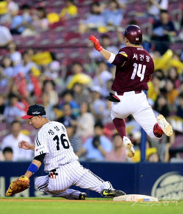 26일 서울 잠실야구장에서 ‘2017 타이어뱅크 KBO리그’ LG 트윈스와 넥센 히어로즈의 경기가 열렸다. 6회초 2사에서 넥센 서건창이 내야땅볼을 치고 난 뒤 1루에서 LG 정성훈과 충돌을 피하려 점프하고 있다.