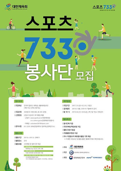 대한체육회(회장 이기흥)가 스포츠 분야 자원봉사를 통해 나눔과 배려를 실천하고 소통하는 제4기 스포츠7330 봉사단을 8월2일까지 모집한다.