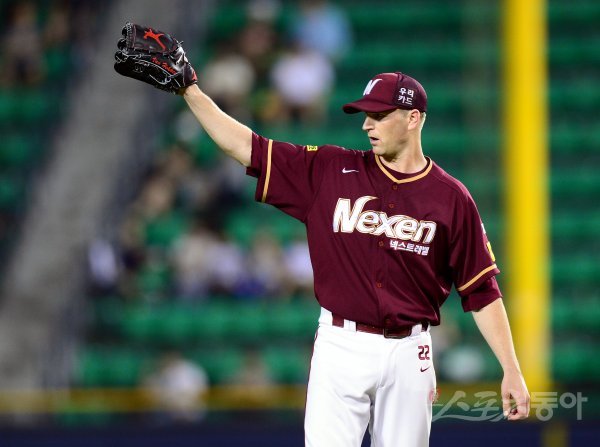 26일 서울 잠실야구장에서 ‘2017 타이어뱅크 KBO리그’ LG 트윈스와 넥센 히어로즈의 경기가 열렸다. 7회말 무사에서 LG 이천웅의 타구를 호수비로 잡은 넥센 고종욱을 향해 선발 밴헤켄이 고마움을 표현하고 있다.