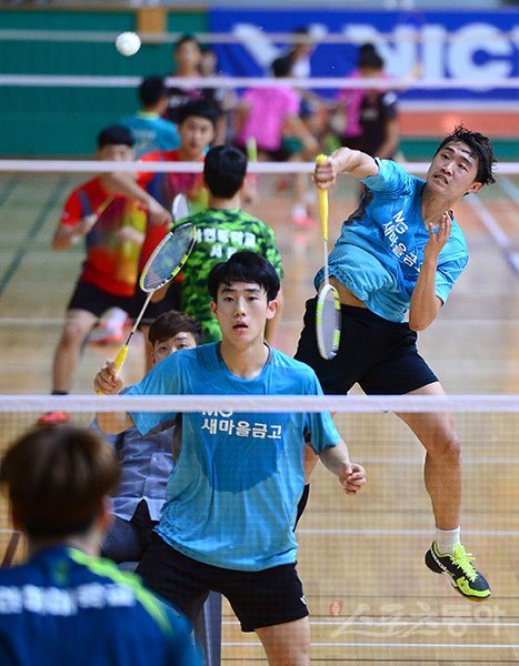 ‘이용대 올림픽제패기념 2017 화순 전국학교대항 배드민턴선수권대회’가 22일부터 28일까지 전남 화순군 하니움문화스포츠센터와 이용대체육관에서 열린다. 26일 남자대학부 복식 준결승에서 백석대 안진하(위)-박문선 조가 스매싱 공격을 하고 있다. 화순 | 김종원 기자 won@donga.com