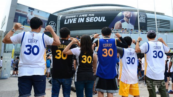 27일 서울 중구 장충체육관에서 ‘스테판 커리 Live in Seoul’이 열렸다. 스테판 커리의 팬들이 유니폼을 보이며 포즈를 취하고 있다.