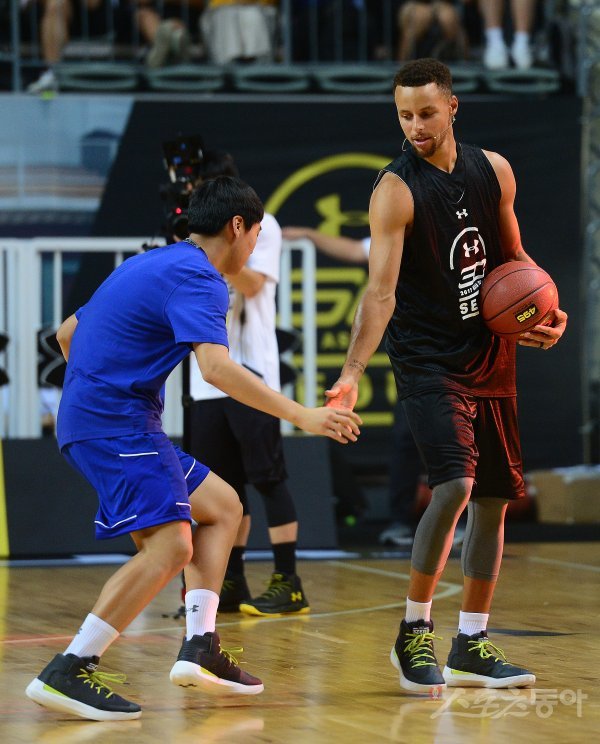 27일 서울 중구 장충체육관에서 ‘스테판 커리 Live in Seoul’이 열렸다. 스테판 커리가 농구 클리닉을 하면서 선수들과 하이파이브를 하고 있다.