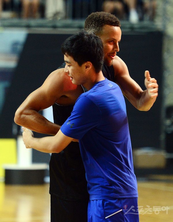 27일 서울 중구 장충체육관에서 ‘스테판 커리 Live in Seoul’이 열렸다. 스테판 커리가 스킬 첼린지를 마친 후 참가자와 포옹을 하고 있다.