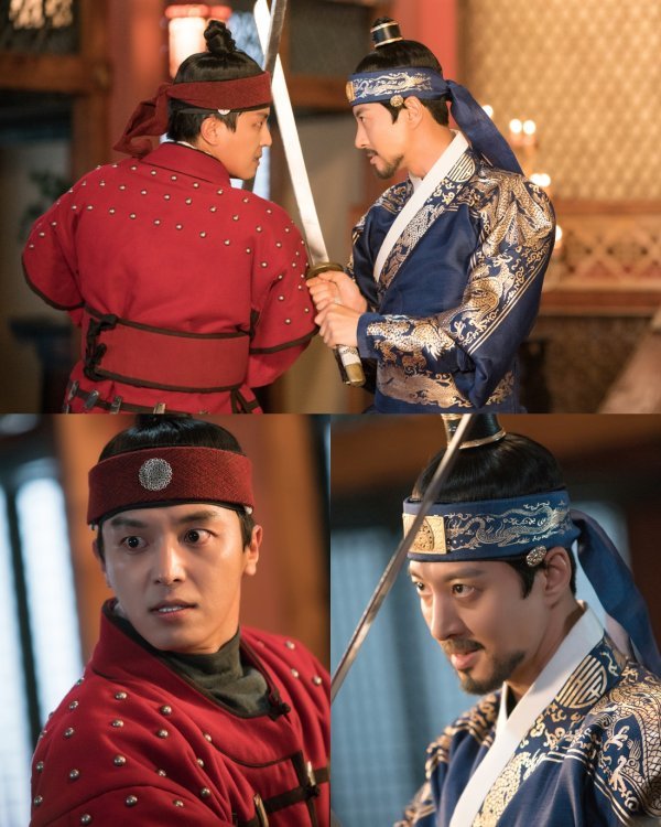 공개된 사진은 27일 방송되는 18회 한 장면을 포착한 것이다. 사진 속 이역과 이융은 궁 편전에서 서로 칼을 맞부딪치고 있다. 두 형제의 칼을 쥔 손, 서로를 뚫어져라 응시하는 눈빛, 굳은 표정까지 무엇 하나 의미심장하지 않은 것이 없다. 이들을 감싼 긴장감은 금방이라도 폭발할 듯 팽팽하다. 여기에 붉은 색과 푸른 색으로, 두 배우의 의상이 주는 색채대비까지 더해져 장면의 강렬함을 높인다.