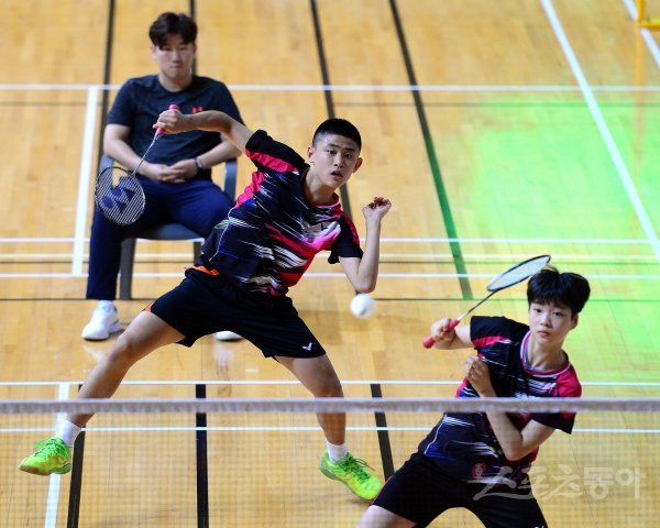 ‘이용대 올림픽제패기념 2017 화순 전국학교대항 배드민턴선수권대회’가 22일부터 28일까지 전남 화순군 하니움문화스포츠센터와 이용대체육관에서 열린다. 중학부 혼합복식 준결승에서 박성찬(구미봉곡중)-구보은(김천여중) 조가 스매싱 공격을 하고 있다.