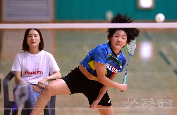 ‘이용대 올림픽제패기념 2017 화순 전국학교대항 배드민턴선수권대회’가 22일부터 28일까지 전남 화순군 하니움문화스포츠센터와 이용대체육관에서 열렸다. 28일 여자중학부 단식 결승에서 명인중 이소율이 스매싱 공격을 하고 있다.