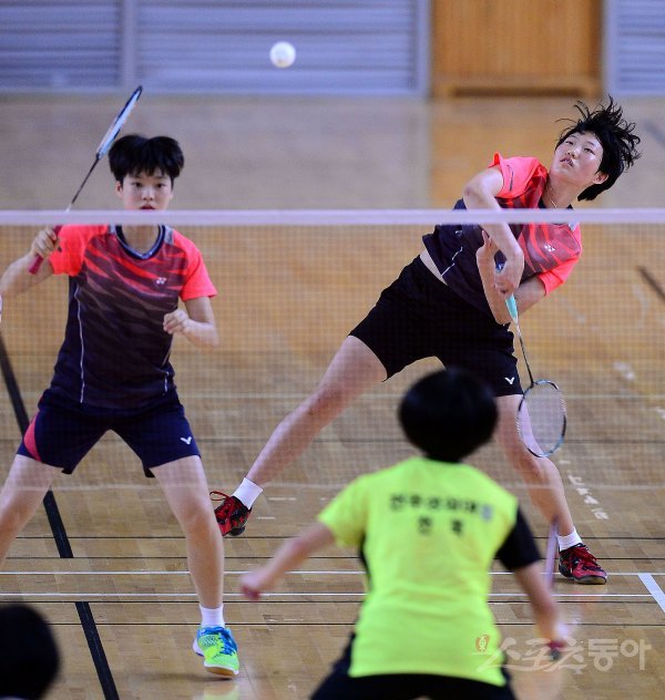 ‘이용대 올림픽제패기념 2017 화순 전국학교대항 배드민턴선수권대회’가 22일부터 28일까지 전남 화순군 하니움문화스포츠센터와 이용대체육관에서 열렸다. 28일 여자중학부 복식 결승에서 김천여중 김보령(오른쪽)-구보은 조가 스매싱 공격을 하고 있다.
