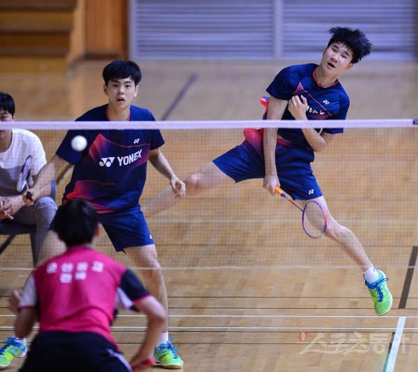 ‘이용대 올림픽제패기념 2017 화순 전국학교대항 배드민턴선수권대회’가 22일부터 28일까지 전남 화순군 하니움문화스포츠센터와 이용대체육관에서 열렸다. 28일 남자고등부 복식 결승에서 전주생명과학고 박설현(오른쪽)-방윤담 조가 스매싱 공격을 하고 있다.