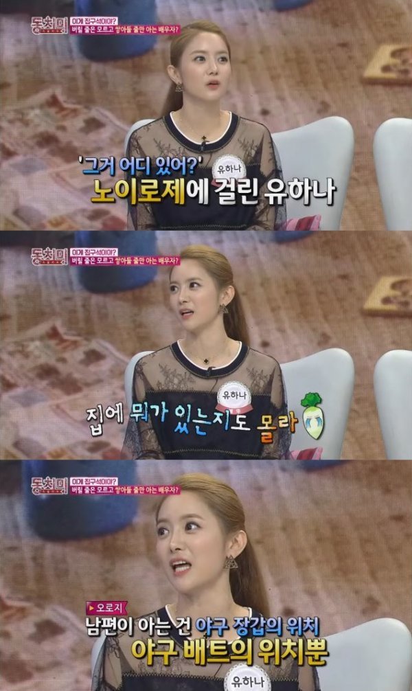 이날 유하나는 “나는 남편의 한 마디에 노이로제에 걸린 적이 있다. 남편은 집에 뭐가 있는 지 아무것도 모르는 사람이다”고 말문을 열어 모두의 궁금증을 자아냈다.