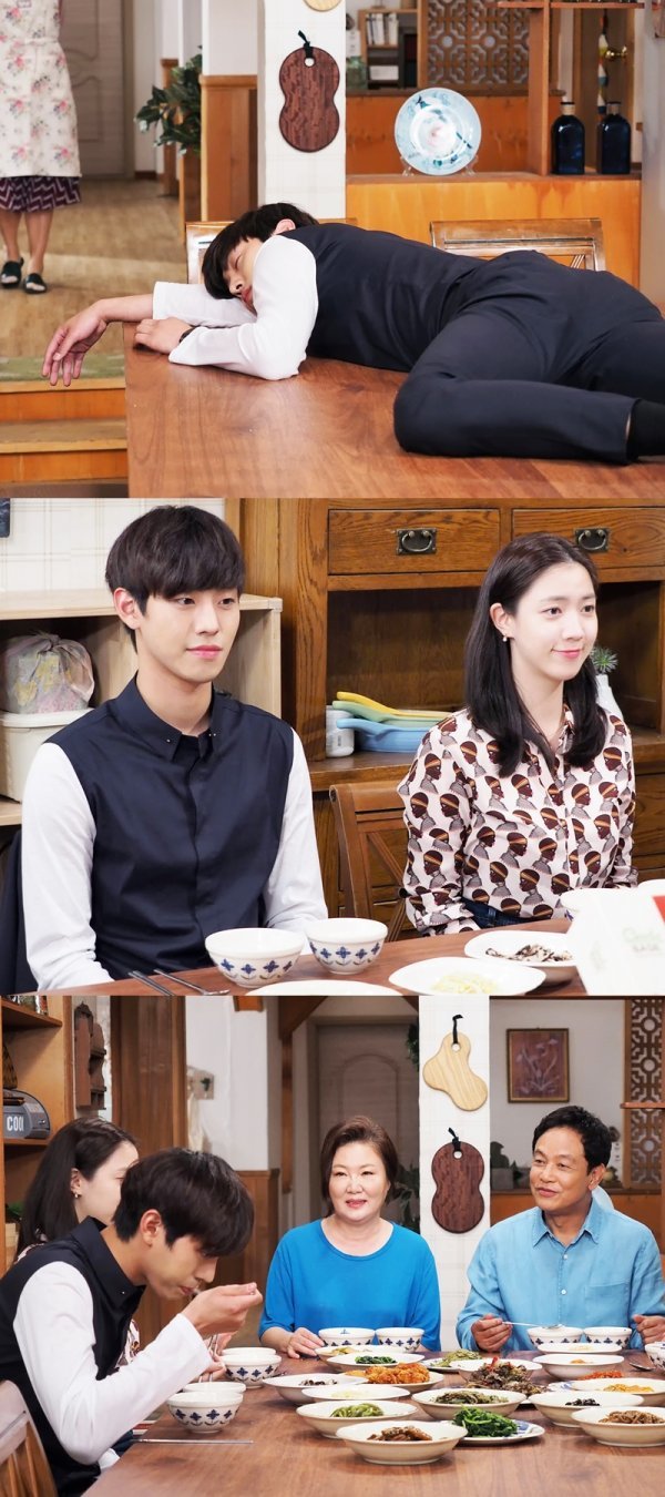 뿐만 아니라 상기된 표정을 통해 그가 여자 친구의 부모님과 함께하는 첫 식사에 잔뜩 긴장하고 있음을 알 수 있다. 또한 맛있게 밥을 먹는 그를 바라보는 변한수(김영철 분)와 나영실(김해숙 분) 부부의 흐뭇한 미소가 눈길을 끈다.