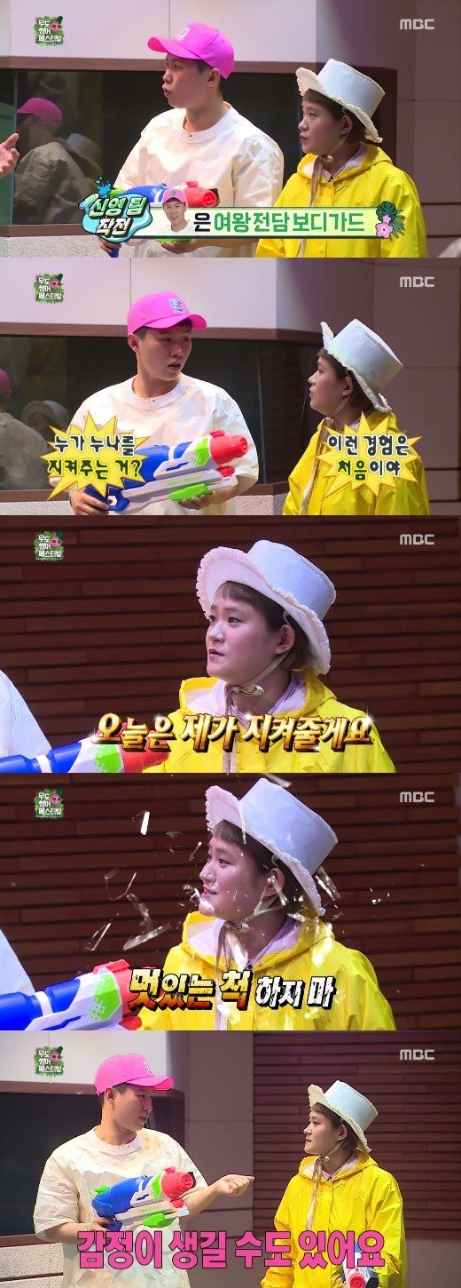 이날 여자 게스트인 김신영과 방송인 홍진경 양 팀으로 나눠져 물총 싸움에 나섰다. 양세형은 김신영에게 "옆에서 보디가드 하겠다"라고 말했다.