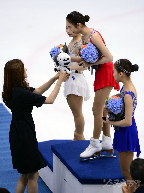 30일 서울 목동 아이스링크에서 평창 올림픽 대표 선발전으로 치뤄지는 ‘KB금융 피겨스케이팅 코리아챌린지’ 경기가 열렸다. 김연아가 여자 시니어 피겨 스케이팅 1위 최다빈에게 축하 선물을 수여하고 있다.