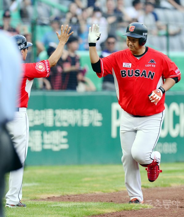 30일 인천 SK행복드림구장에서 ‘2017 타이어뱅크 KBO리그’ SK 와이번스와 롯데 자이언츠의 경기가 열렸다. 2회초 무사에서 롯데 이대호가 SK 선발 켈리를 상대로 중월 동점 솔로 홈런을 쏘아올린 뒤 최만호 코치의 환영을 받고 있다.