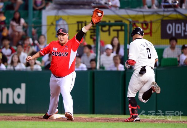 30일 인천 SK행복드림구장에서 ‘2017 타이어뱅크 KBO리그’ SK 와이번스와 롯데 자이언츠의 경기가 열렸다. 7회말 2사에서 SK 김강민이 내야 땅볼을 치고 난 뒤 1루에서 아웃되고 있다.