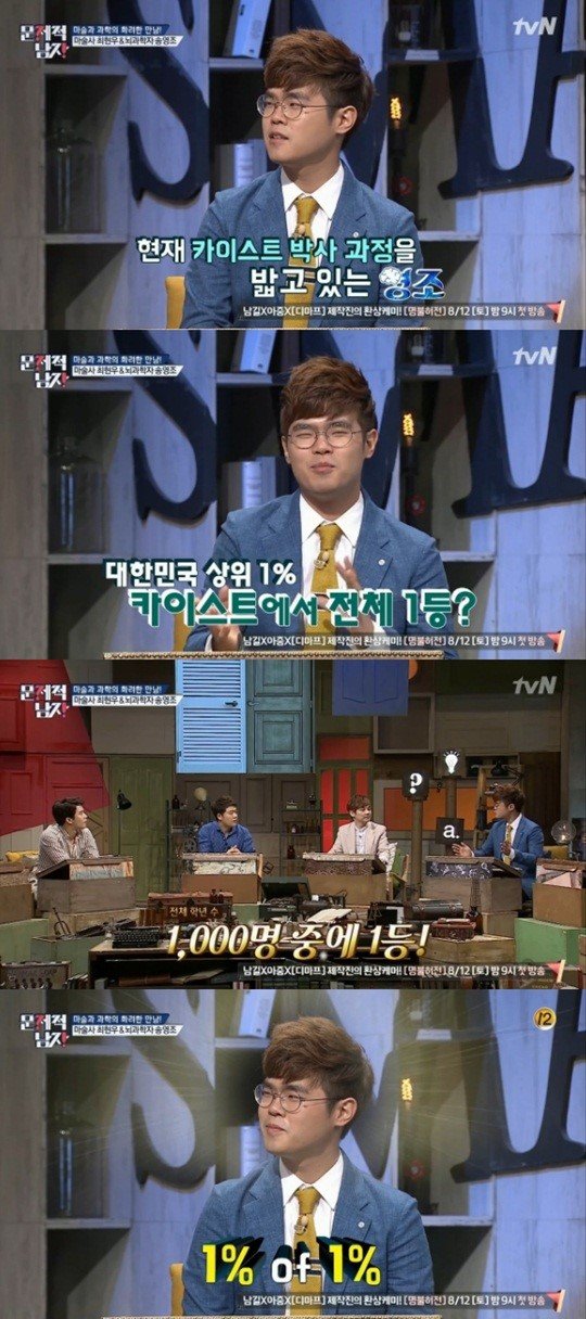 이날 방송에서 송영조는 "현재 카이스트 박사 과정을 밝고 있다"며 "카이스트에서 전체 1등을 몇 번 한 적이 있다"고 자신을 소개했다.