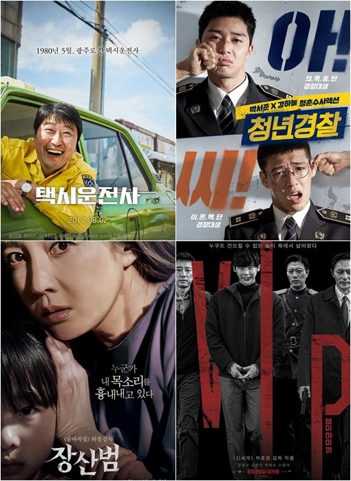 8월에는 다양한 장르의 한국 영화가 관객들을 찾아간다. 광주 민주화 운동의 이야기를 외부인의 시선으로 본 송강호 주연의 ‘택시운전사’와 경찰대학에서 만난 두 청년이 사건을 유쾌하게 해결해나가는 박서준·강하늘 주연의 ‘청년경찰’, 그리고 ‘숨바꼭질’의 허정 감독과 ‘장화, 홍련’ 이후 14년 만에 스릴러로 돌아온 염정아 주연의 ‘장산범’, ‘신세계’의 박훈정 감독과 악역 연기를 시도한 이종석 주연의 ‘브이아이피’까지 다양한 볼거리가 8월 극장가를 장악한다.