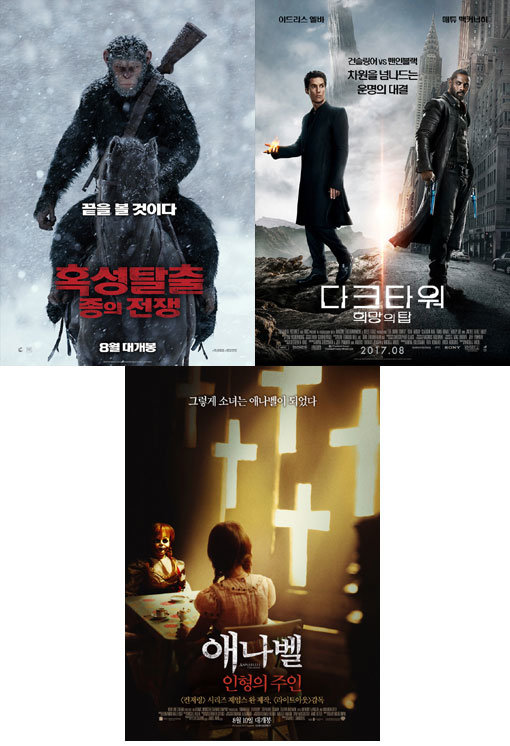 외화가 강세인 2017년, 8월에도 만만치 않은 작품들이 몰려온다. ‘혹성탈출’ 시리즈의 세 번째 작품인 ‘혹성탈출 : 종의 전쟁’과 베스트셀러 작가 스티븐 킹의 소설을 원작으로 한 ‘다크타워 :희망의 탑’, ‘컨저링’ 유니버스의 시작점을 알린 ‘애나벨 : 인형의 주인’이 그 주인공이다.