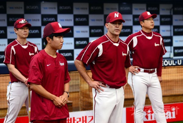 1일 서울 고척스카이돔에서 ‘2017 타이어뱅크 KBO 리그’ SK와이번스와 넥센히어로즈 경기가 열린다. 1군 투수코치로 승격된 넥센 브랜든 나이트 코치가 브리검과 이야기 하고 있다.