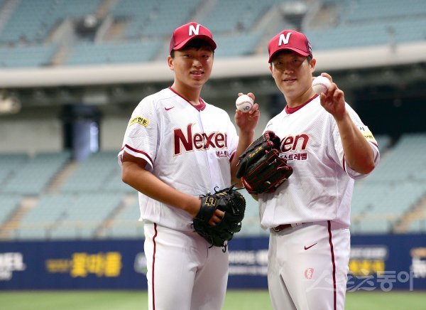 1일 서울 고척스카이돔에서 ‘2017 타이어뱅크 KBO 리그’ SK와이번스와 넥센히어로즈 경기가 열린다. 경기 전 트레이드 마감 시한인 7월 31일 KIA에서 트레이드 되어 온 이승호(왼쪽)과 손동욱이 넥센 선수들과 상견례를 마치고 포토 타임을 갖고 있다.