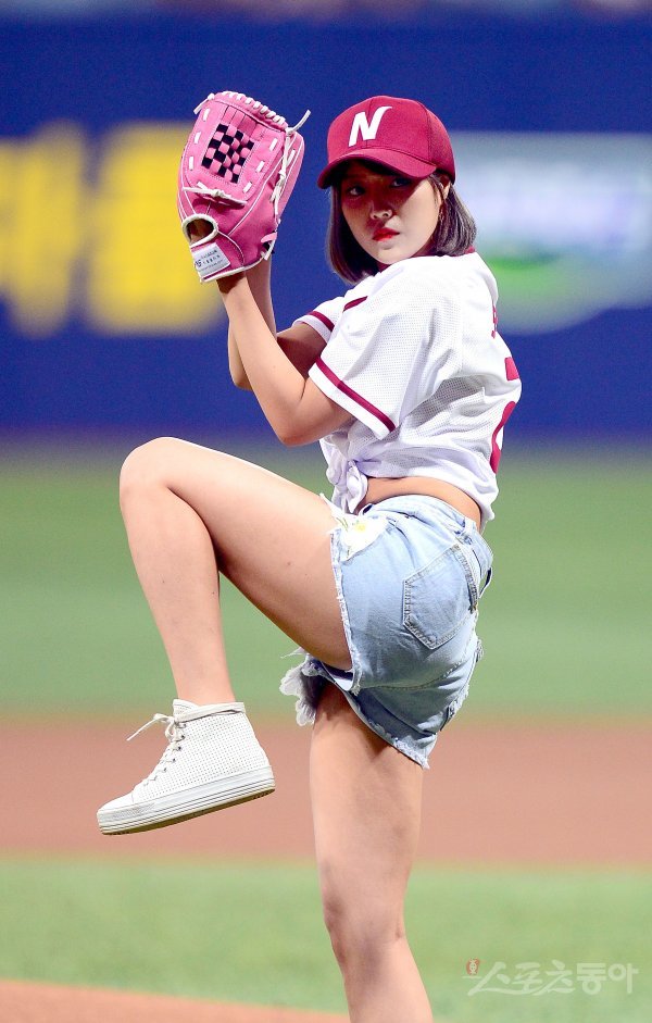 1일 서울 고척스카이돔에서 ‘2017 타이어뱅크 KBO 리그’ SK와이번스와 넥센히어로즈 경기가 열렸다. 경기 전 걸그룹 ‘리브하이’ 보혜가 시구를 하고 있다.
