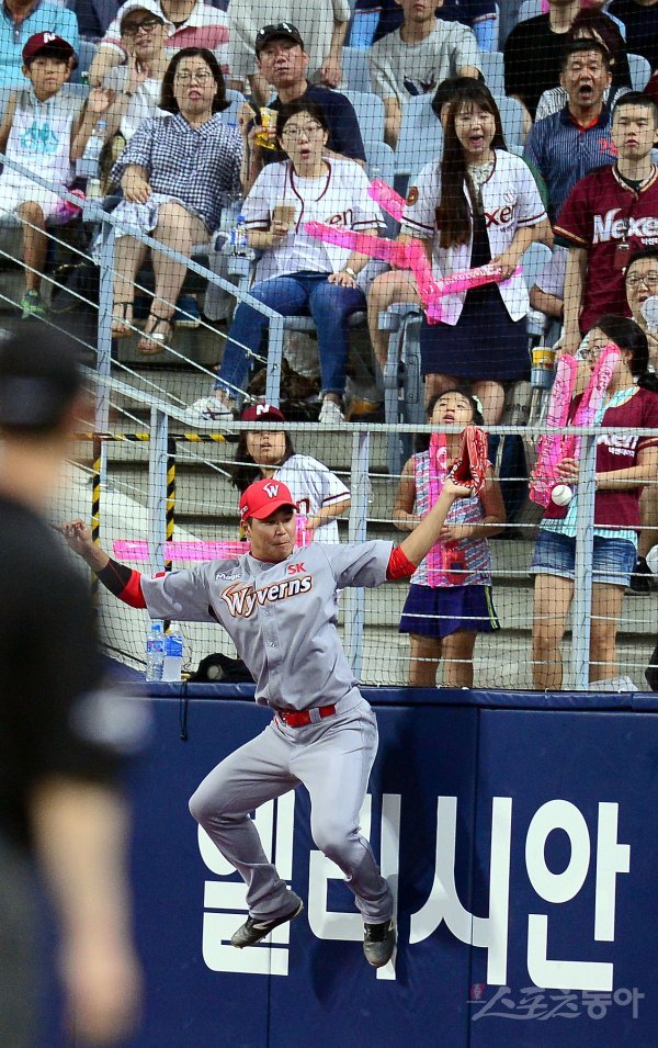 1일 서울 고척스카이돔에서 ‘2017 타이어뱅크 KBO 리그’ SK와이번스와 넥센히어로즈 경기가 열렸다. 6회말 무사 1루 SK 우익수 한동민이 넥센 초이스의 파울볼을 잡으려 했으나 아쉽게 놓치고 있다.