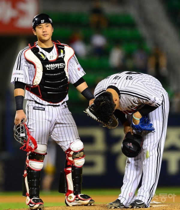 1일 서울 잠실야구장에서 ‘2017 타이어뱅크 KBO리그’ LG트윈스와 롯데자이언츠의 경기가 열렸다. 6회초 무사 1루에서 교체를 앞둔 LG 선발 김대현이 강상수 투수코치를 향해 고개 숙여 인사를 하고 있다.