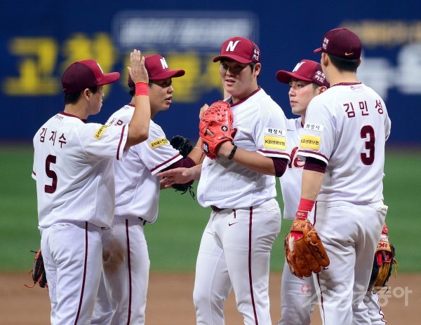 1일 서울 고척스카이돔에서 ‘2017 타이어뱅크 KBO 리그’ SK와이번스와 넥센히어로즈 경기가 열렸다. 3-0 승리를 거두며 3연승을 달린 넥센 선수들이 하이파이브 하고 있다.