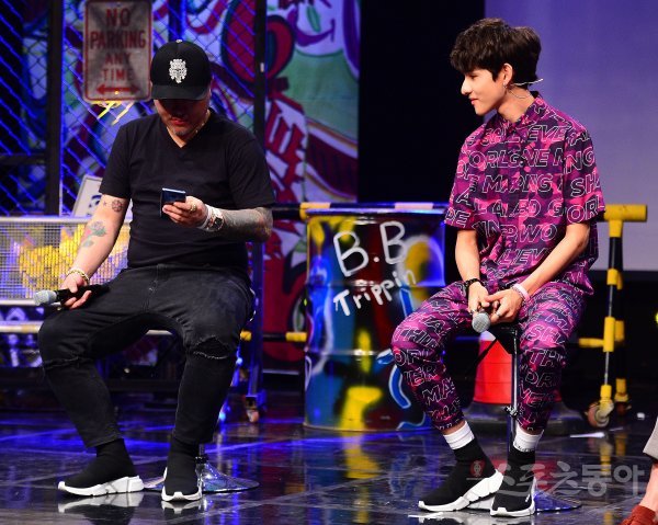 용감한 형제(오른쪽)가 기자간담회 중 스마트폰을 보고 있다.