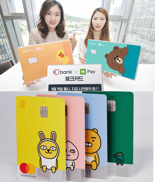 라인프렌즈 캐릭터를 넣은 케이뱅크 ‘네이버페이 체크카드’(위)와 카카오프렌즈 캐릭터를 전면에 내세운 카카오뱅크 체크카드 등 금융업계가 트렌드에 민감한 젊은층을 공략하기 위해 캐릭터 카드를 출시한다. 사진제공 l 케이뱅크·카카오뱅크