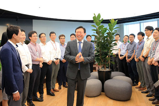 신동빈 롯데그룹 회장은 2일부터 서울 잠실 롯데월드타워 신사옥 집무실로 출근을 시작했다. 신 회장은 이날 17층과 18층에 위치한 경영혁신실 업무 공간 등을 둘러보고, 임직원들을 격려하는 시간을 가졌다(사진). 신 회장의 집무실은 경영혁신실 가치경영팀, HR혁신팀 등과 함께 18층에 있다. 롯데그룹은 신 회장 집무실을 비롯해 경영혁신실 및 컴플라이언스위원회, 사회공헌위원회 등이 롯데월드타워로 입주를 마치고 업무를 시작했다. 신 회장은 “한국 롯데 창립 50주년을 맞은 해에 월드타워 신사옥으로 입주하게 됐다”며 “첨단 오피스 환경을 통해 상상력과 유연한 사고를 발휘하고 소통이 활발하게 이뤄져 새로운 기업문화를 만들어달라”고 당부했다.