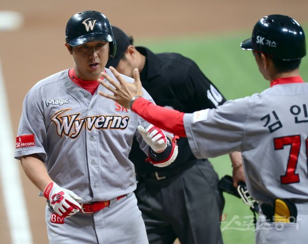 2일 서울 고척스카이돔에서 ‘2017 타이어뱅크 KBO 리그’ SK와이번스와 넥센히어로즈 경기가 열렸다. 1회초 무사 2루 SK 최정이 좌월 투런 홈런을 날리고 그라운드를 돌아 홈인하며 하이파이브 하고 있다.