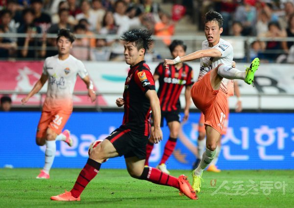 2일 서울월드컵경기장에서 2017 KEB하나은행 K리그 클래식 24라운드 FC서울과 강원FC의 경기가 열렸다. 전반 강원FC 김경중이 FC서울 패널티 라인 안에서 슛을 시도했으나 황현수의 맨마킹에 막히고 있다.