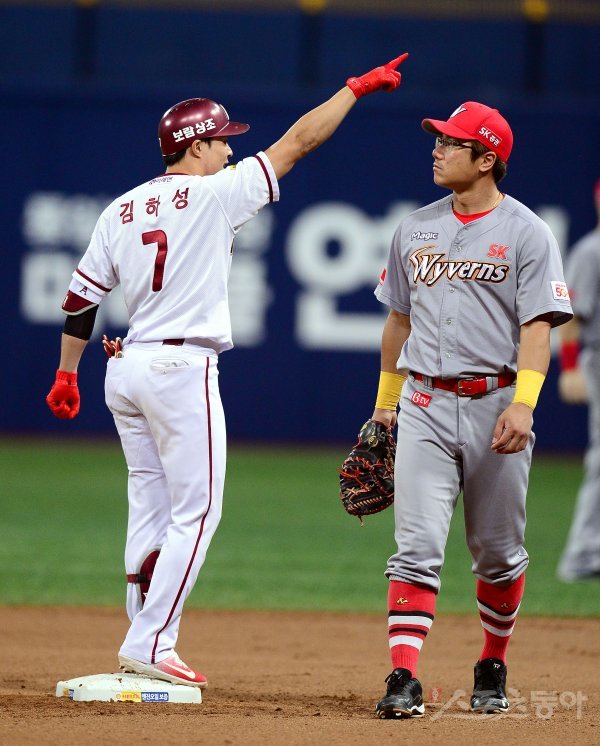 2일 서울 고척스카이돔에서 ‘2017 타이어뱅크 KBO 리그’ SK와이번스와 넥센히어로즈 경기가 열렸다. 8회말 1사 2루 넥센 김하성이 동점을 만드는 1타점 중전 2루타를 치고 2루에서 환호하고 있다.