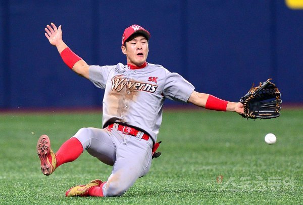 2일 서울 고척스카이돔에서 ‘2017 타이어뱅크 KBO 리그’ SK와이번스와 넥센히어로즈 경기가 열렸다. 8회말 2사 2루 SK 노수광이 넥센 김민성의 타구를 놓치고 있다.